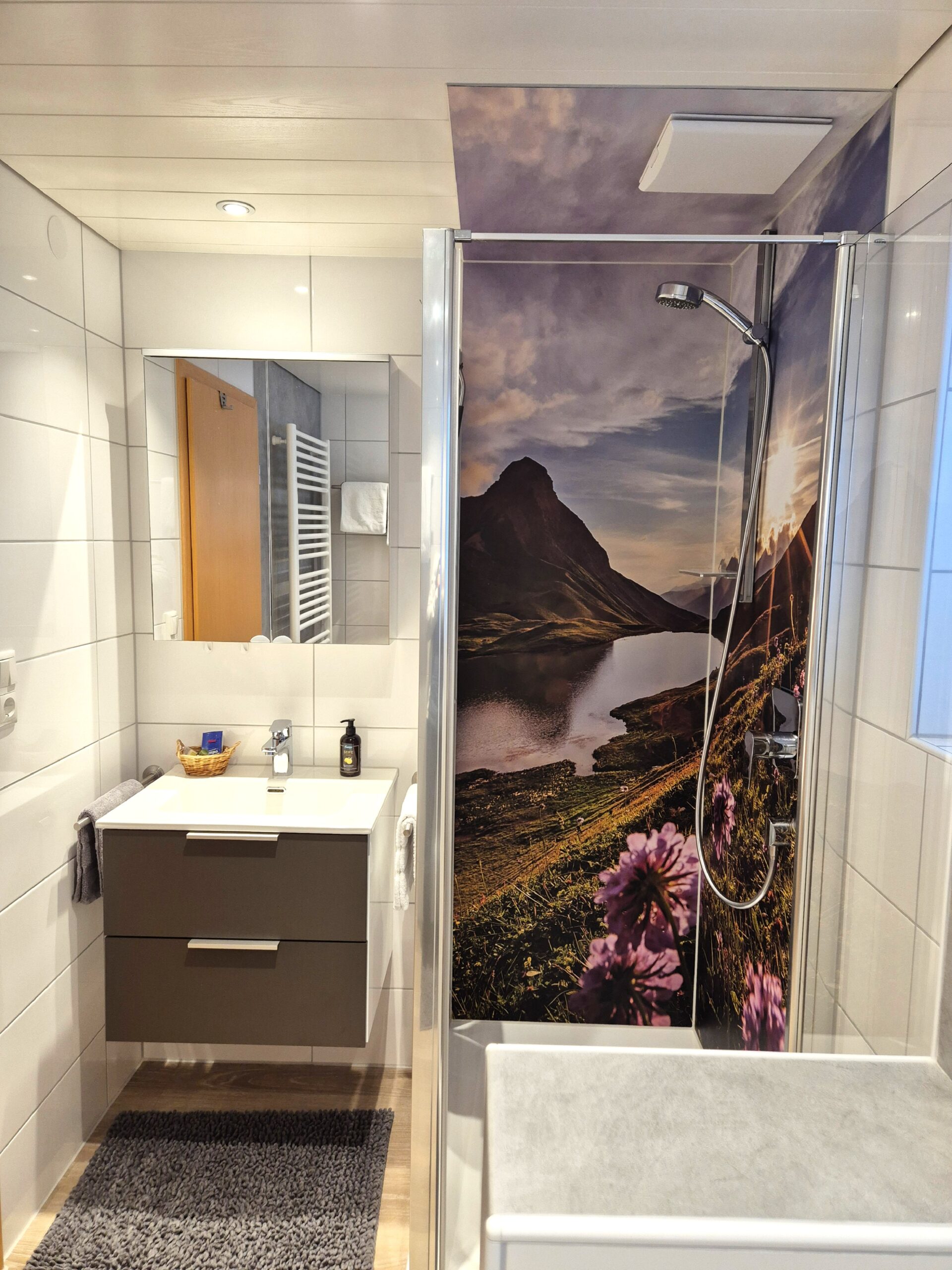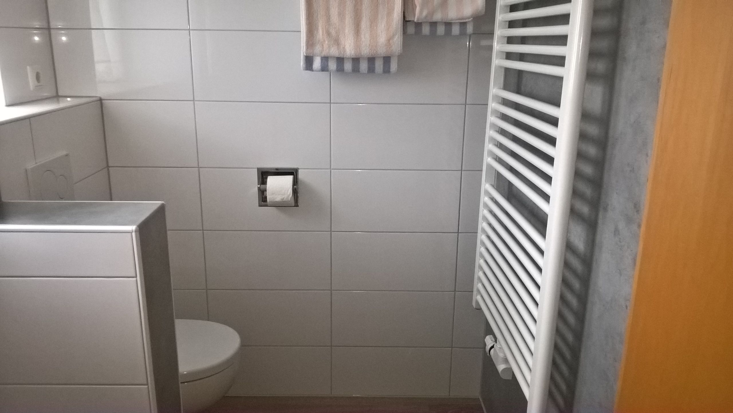 Badezimmer: Das Bad mit Dusche, WC, Waschbecken, Haartrockner und Kosmetikspiegel ist durch zwei Fenster hell und freundlich gestaltet. Auch Hand- und Duschtücher werden selbstverständlich bereitgestellt. Auf Wunsch kann die Waschmaschine benützt werden.